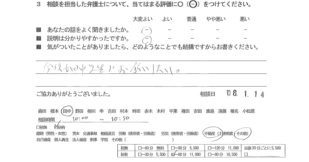 お客様の声(ご相談者の声)評判・口コミ 公開日:2026/02/12 お客様の声 ■担当弁護士 田中智美 ■あなたの話をよく聞きましたか 大変よい ■説明はわかりやすかったですか 大変よい 今後も田中先生にお願いしたい。 関連投稿: お客様の声31 お客様の声53 お客様の声(ご依頼者の声)口コミ・評判 お客様の声(相談者の声) 「お客様の声(ご相談者の声)評判・口コミ」
