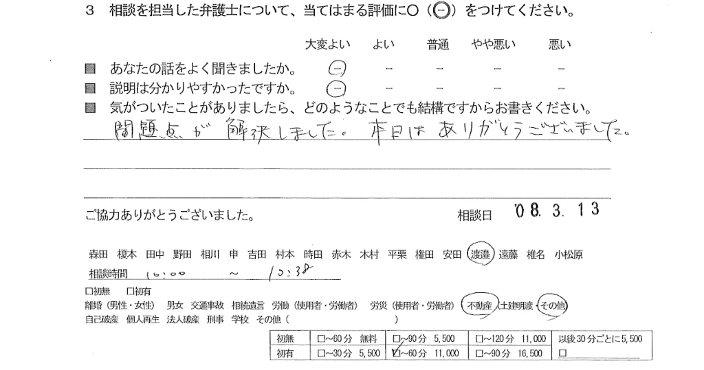 お客様の声(ご相談者の声)評判・口コミ 公開日:2026/04/30 お客様の声 ■担当弁護士 渡邉 千晃 ■あなたの話をよく聞きましたか 大変よい ■説明はわかりやすかったですか 大変よい 問題点が解決しました。本日はありがとうございました。 関連投稿: お客様の声31 お客様の声53 お客様の声(ご依頼者の声)口コミ・評判 お客様の声(相談者の声) 「お客様の声(ご相談者の声)評判・口コミ」 「不動産使用貸借関係清算示談交渉事件」
